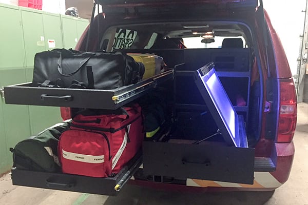 We recently partnered with FastLane Emergency Vehicles who is the premier manufacturer of custom and specialty first responder vehicles. We recently delivered to Big Sewickley Creek Volunteer Fire Department in Sewickley, PA a FastLane Custom Fabricated Command Cabinet which was installed in their Chevy Suburban Response Vehicle. This customized cabinet included a lighted command flip-up surface and specialized storage trays to carry multiple fire & EMS equipment. This FastLane product was sold by Ryan Quahliero who is Penn Care’s Ambulance Sales Representative in PA.