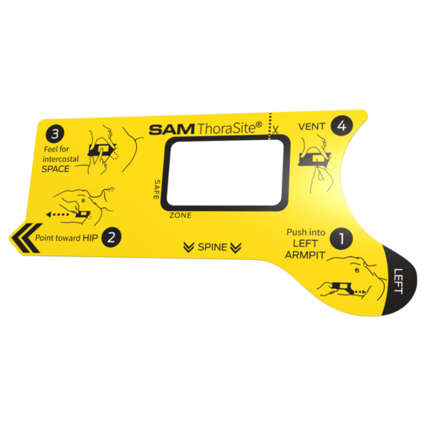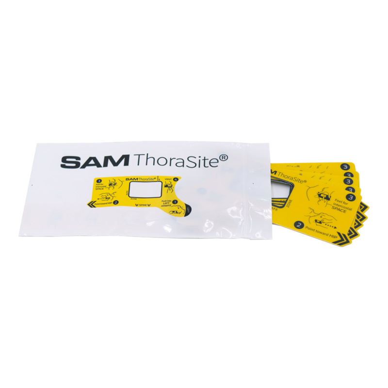 SAM ThoraSite is an anatomical landmark guide, designed to provide a safer approach to the pleural space by pinpointing the procedure site. The device aids in identifying the appropriate intercostal space for lateral thoracostomies and similar procedures. ThoraSite is non-sterile and intended to be single-use.